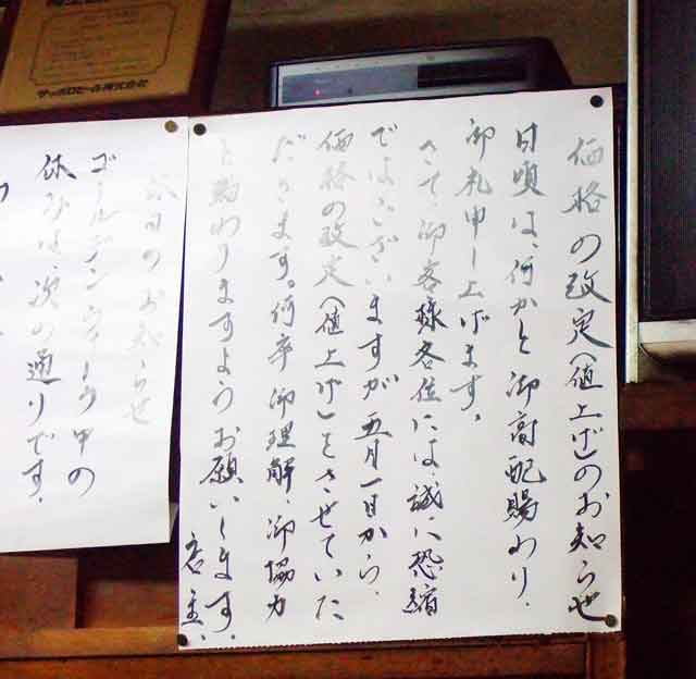 カウンターに座ると5月から、値上げされる旨の張り紙がありました。