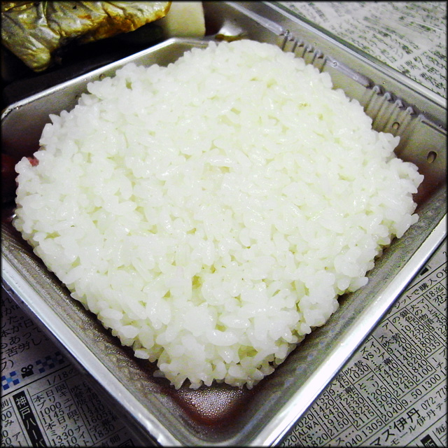 炊きたて白御飯、四隅が空いてるのは一度茶碗に御飯を盛ってから弁当に入れるからですね (^_^;)