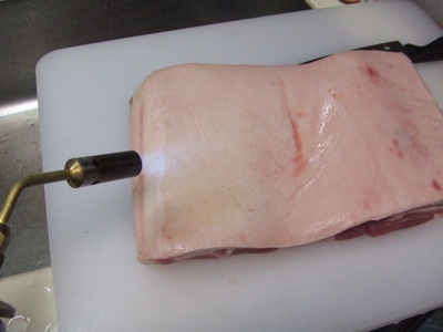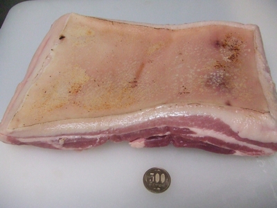 豚3枚肉、1昼夜、糠と炊いて、更に水から炊いて油抜き、、、切り分けて、糸でくくり、これから味噌と炊くところです。